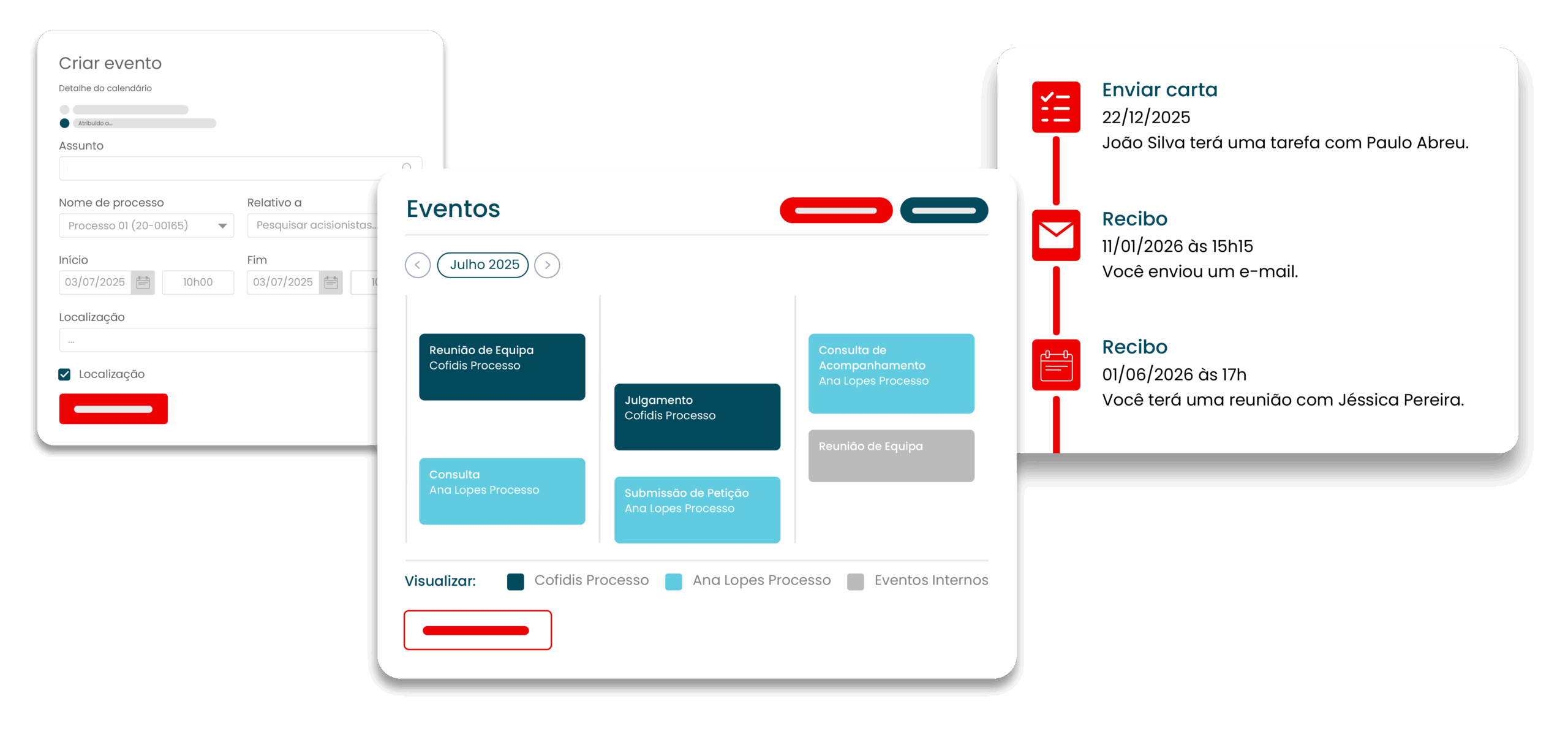O Rolling Legal conecta o calendário a todas as componentes do trabalho jurídico, processos, tarefas, reuniões e documentos, para que nada fique disperso.