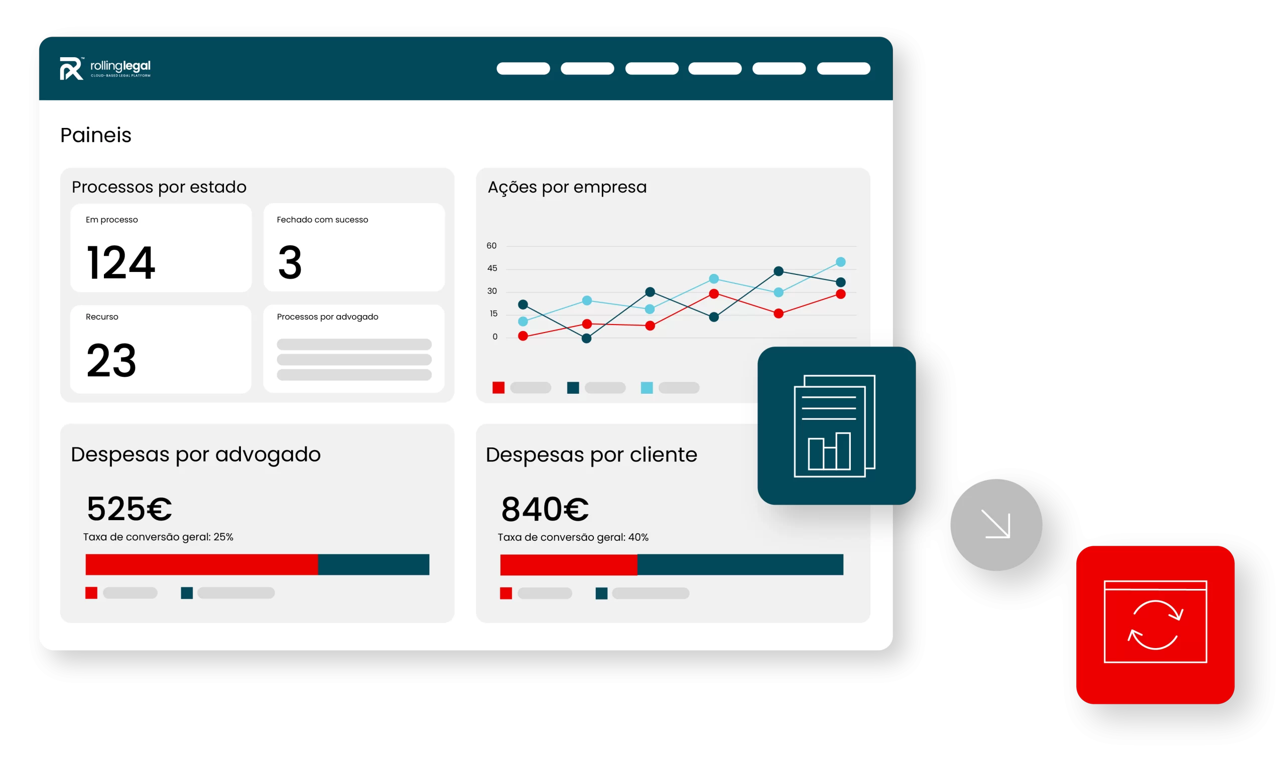 - Monitorize KPIs jurídicos e acompanhe prazos, processos e desempenho da equipa.