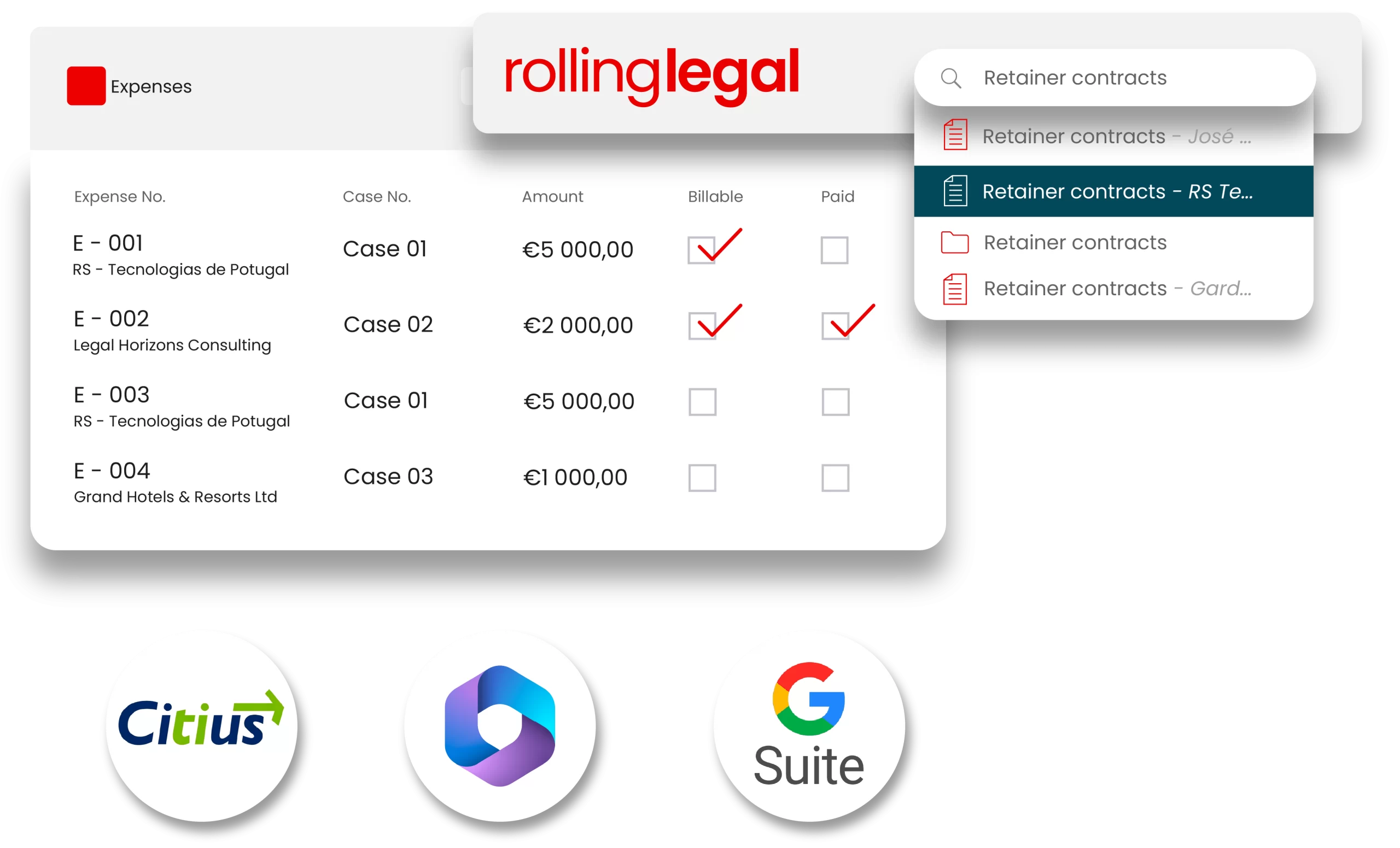 Rolling Legal integrates with Citius through a partner add-on, making it possible to receive notifications, alerts and updates directly within the platform.